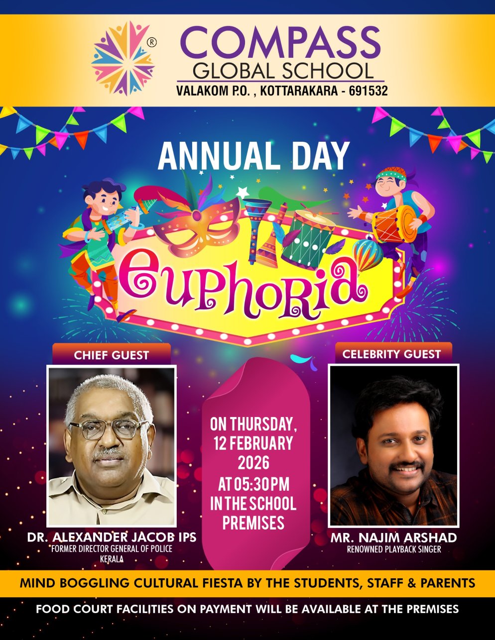 DATE : THURSDAY, 12 FEBRUARY 2026 TIME : 05:30PM CHIEF GUEST : DR. ALEXANDER JACOB IPS (FORMER DIRECTOR GENERAL OF POLICE, KERALA) CELEBRITY GUEST : NAJIM ARSHAD, RENOWNED PLAYBACK SINGER