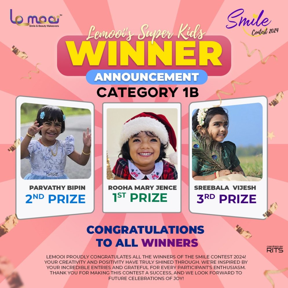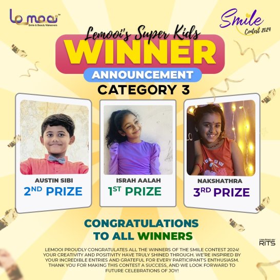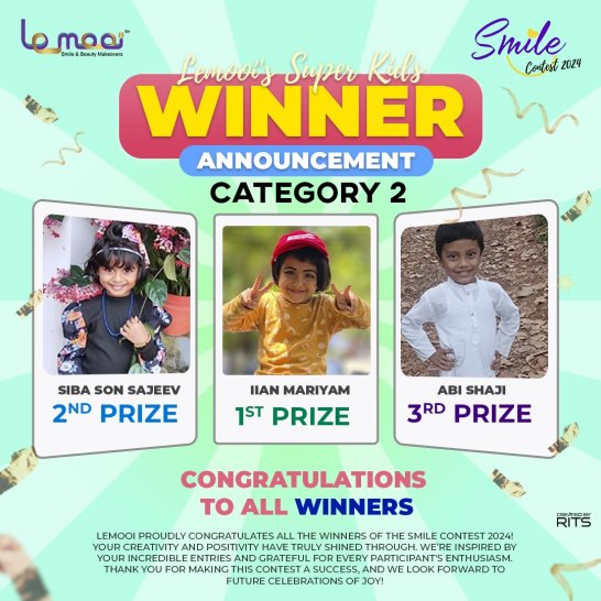 In the Lemooi Smile 2024 Contest, three of our students won prizes. ROOHA MARY JENCE (PRE KG) SIBASEN SAJEEV (LKG) NAKSHATRA (Class 2)